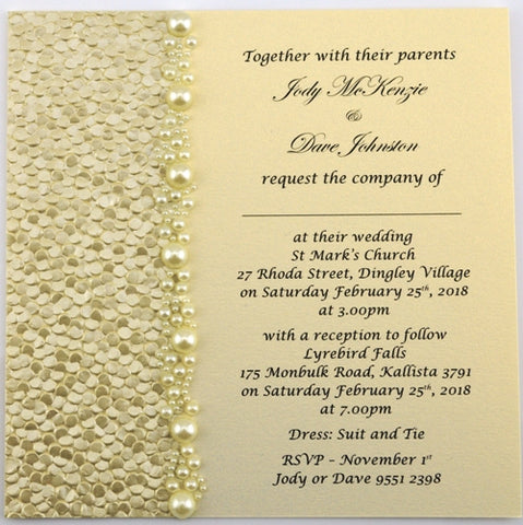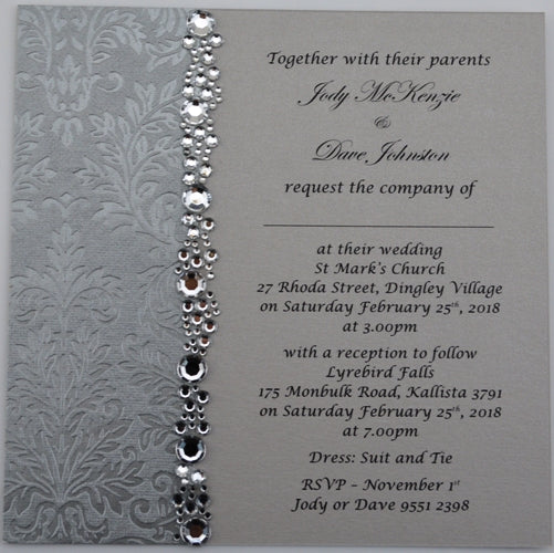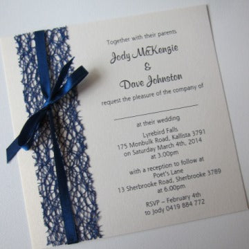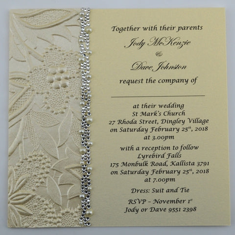 Our range of handmade invitations are fully customisable. Mix and match our range of papers, ribbons and embellishments to design and create an unique design for your special day. We design, print and assemble onsite, allowing us full flexibility to work with you.