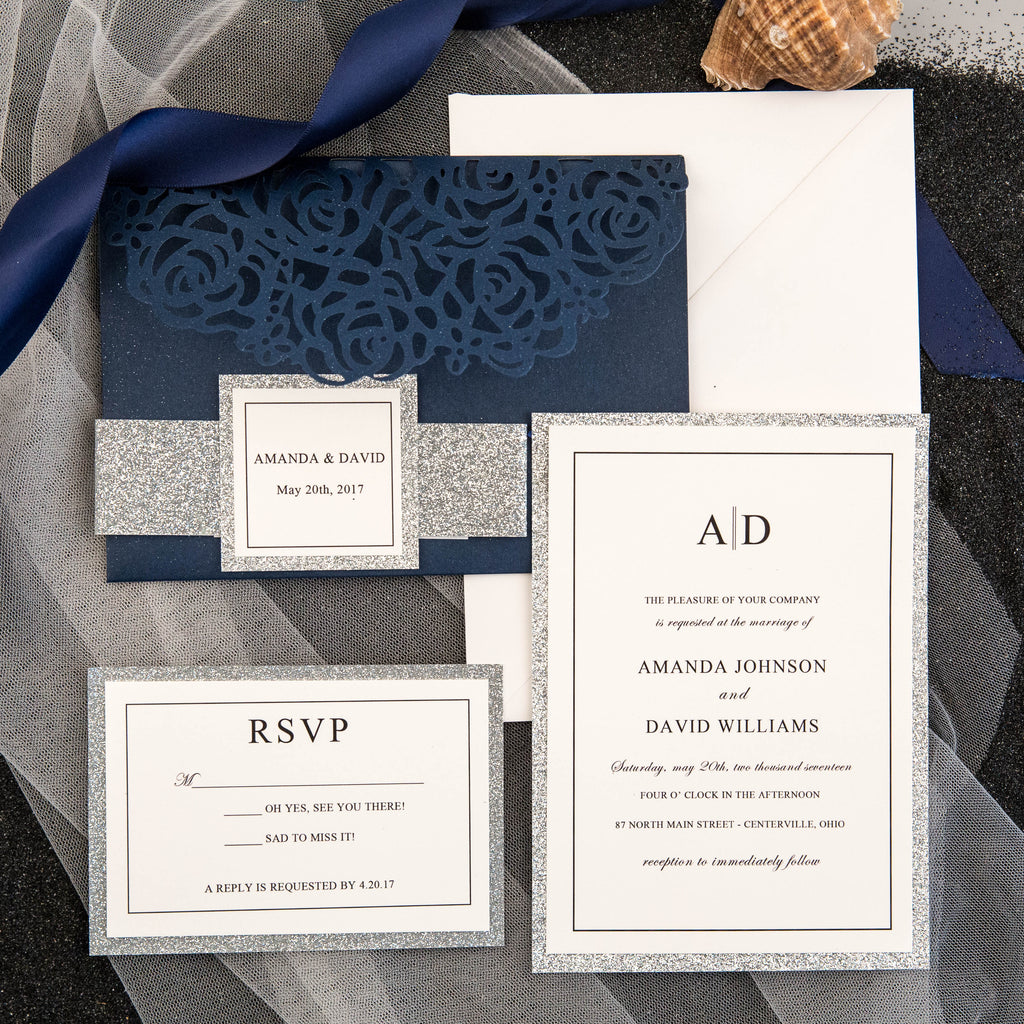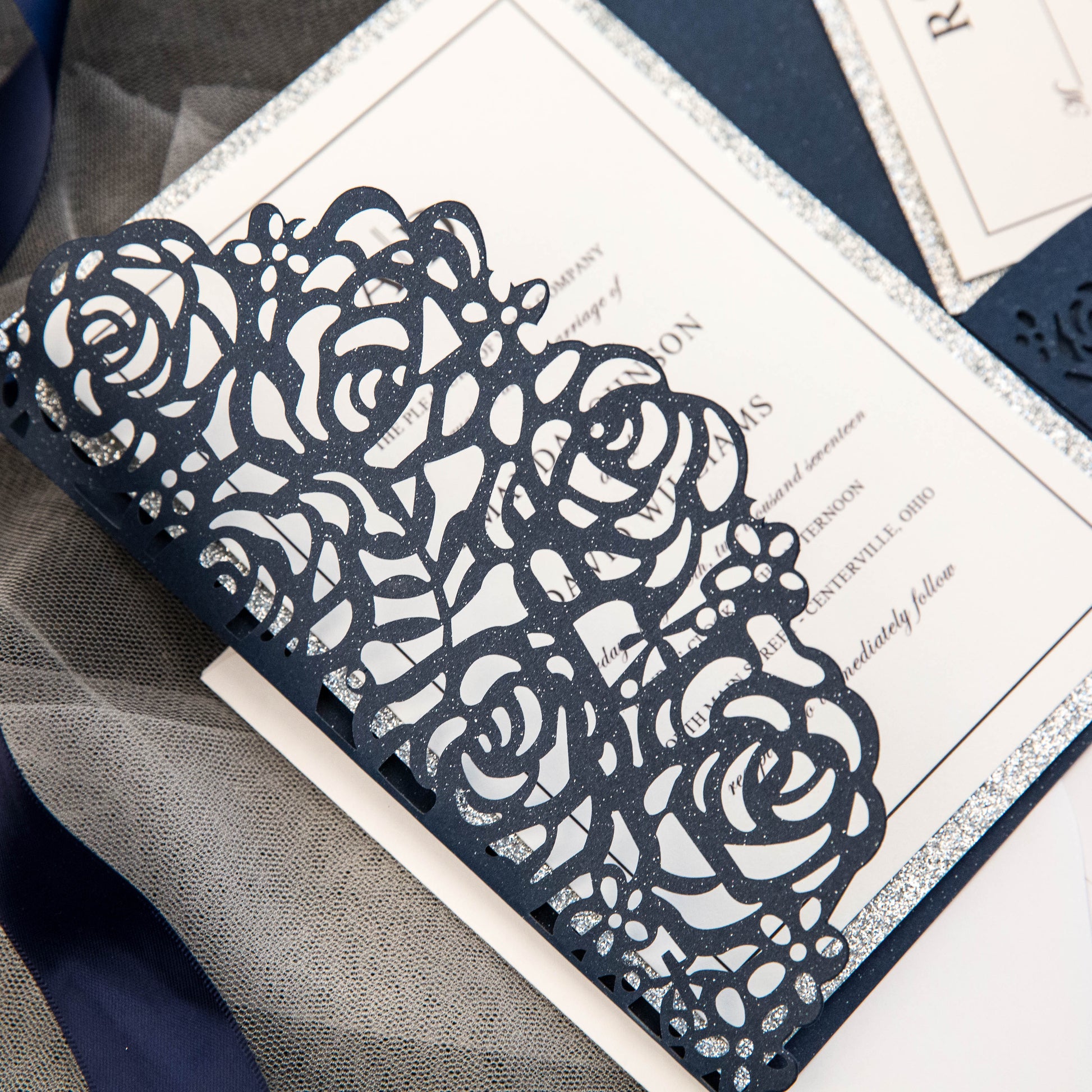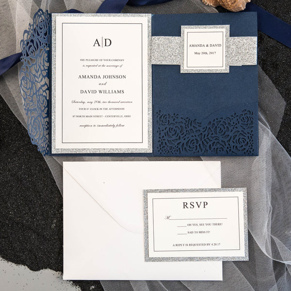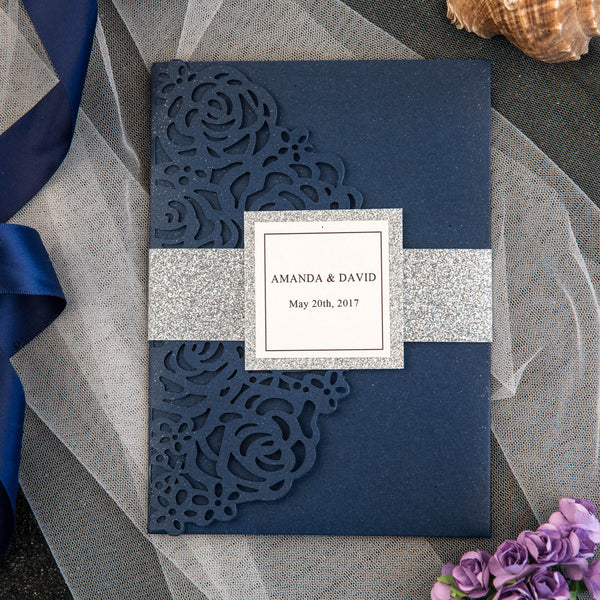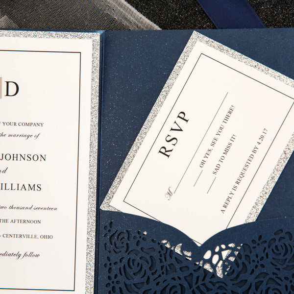 Rose Design Navy Tri-fold Pocket Invitation (Ready 2 GO Set)